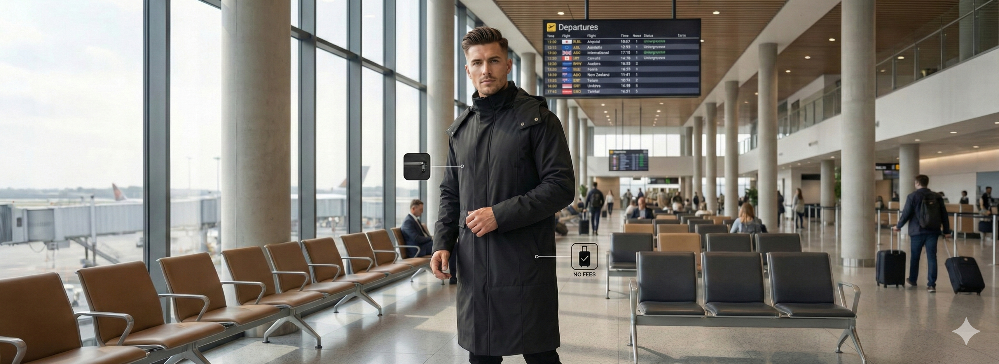 Travelers wear their storage. Clothes and essentials fit inside the jacket, no carry-on needed, no baggage fees, and hands-free airport movement.